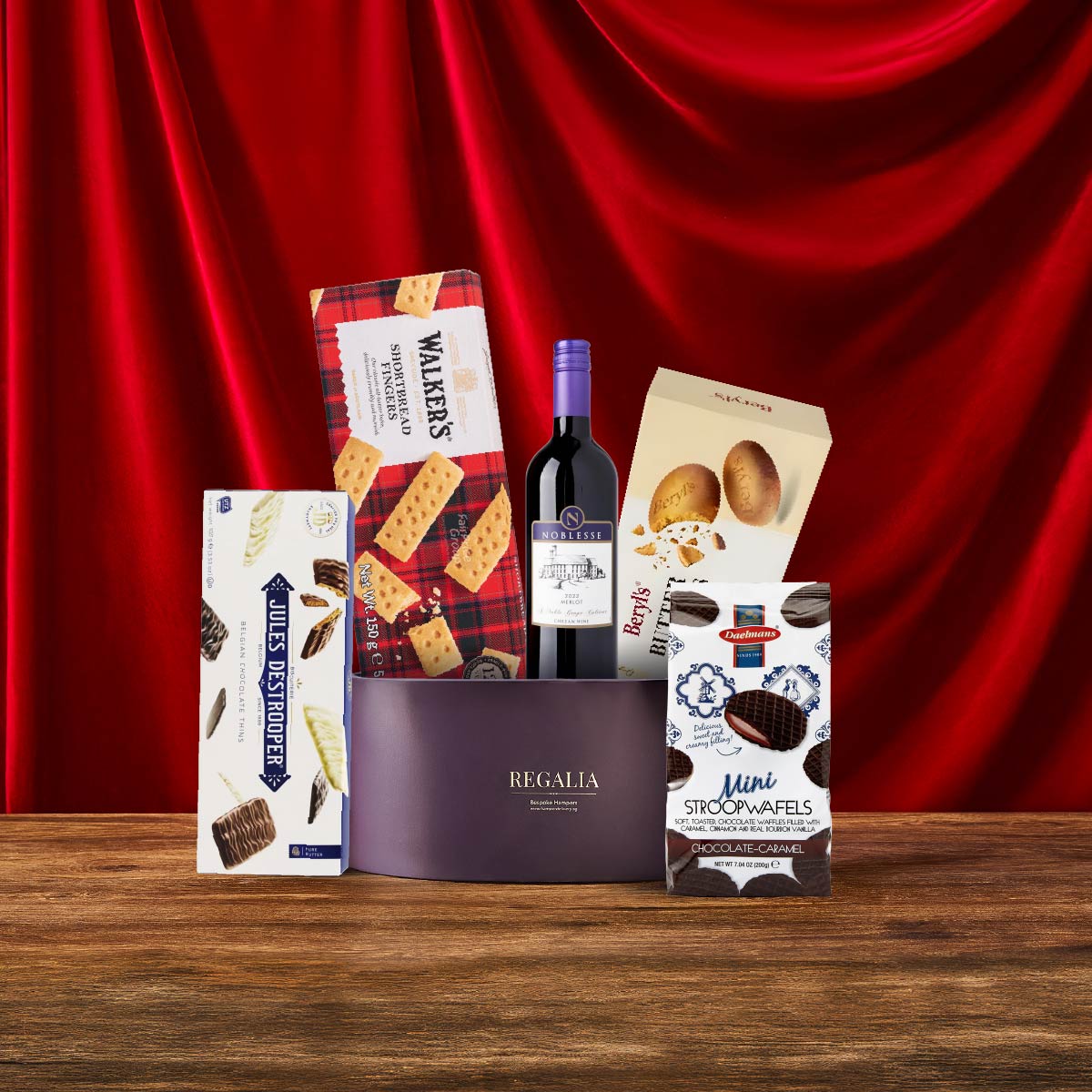 Elegant and indulgent, the Aurelia Hamper features a bottle of Noblesse Merlot Chile Red Wine 2024 (750ml) paired with Walkers Shortbread, Beryl’s Butter Cookies, Jules Destrooper biscuits, and Daelmans Stroopwafels. A refined gift of taste and sophistication, perfect for any celebration.