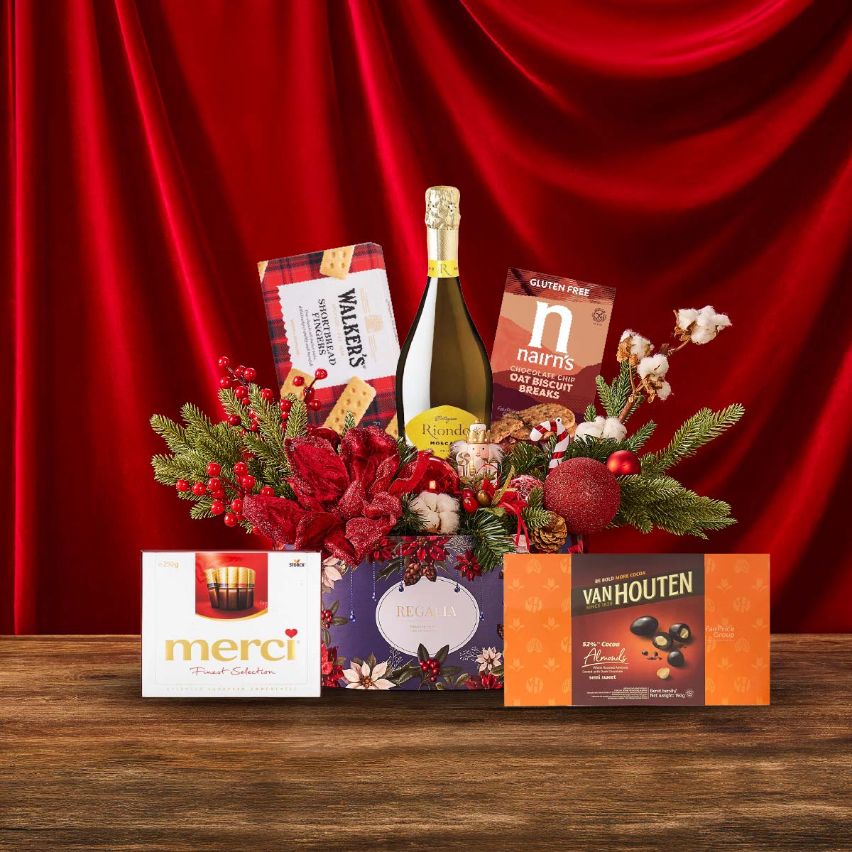 Celebrate life’s finest moments with the Opulence Hamper, featuring a bottle of Riondo Collezione Falceri Moscato (750ml) surrounded by festive red and lush evergreens artificial arrangement. Accompanied by Walkers Shortbread, Merci chocolates, Van Houten dark chocolates, and Nairn’s oat biscuits, this elegant curation brings joy, sparkle, and sophistication to every occasion. Perfect for festive celebrations, thank-you gifts, and luxury gatherings.