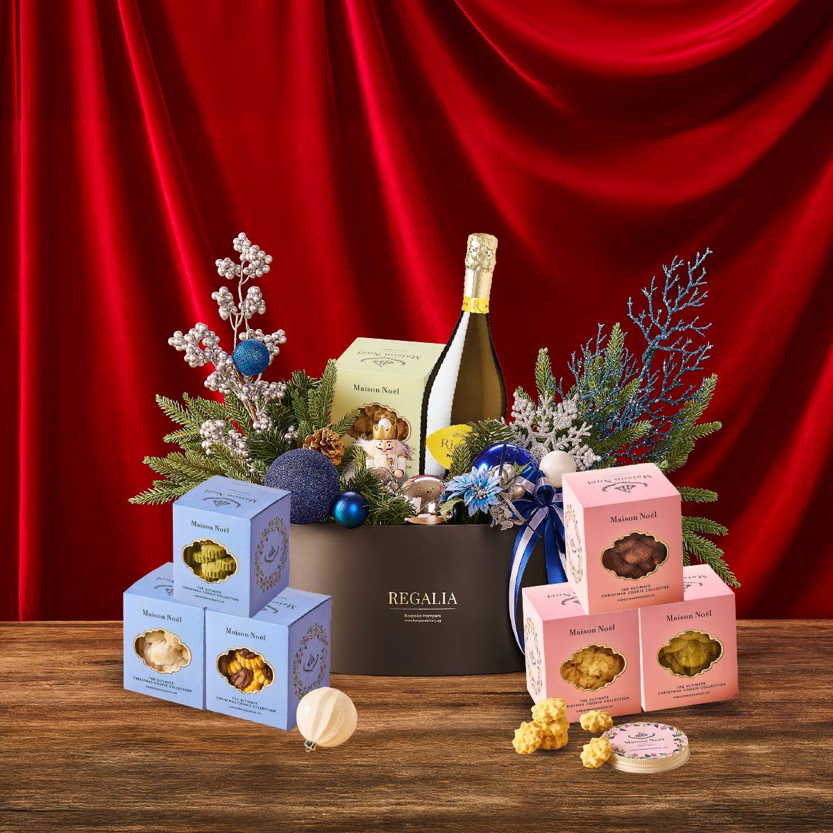 Celebrate in timeless elegance with the Signature Wine Hamper, featuring a Riondo Collezione Falceri Moscato (750ml) surrounded by artificial winter-inspired florals and evergreens. Paired with an assortment of Maison Noël cookies, this luxurious curation blends sweetness, sparkle, and sophistication — a perfect gift for any festive occasion. Perfect for holiday gifting, corporate appreciation, or sparkling celebrations.